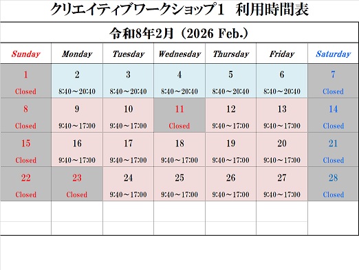 クリエイティブワークショップ1の利用時間は以下の通りです。